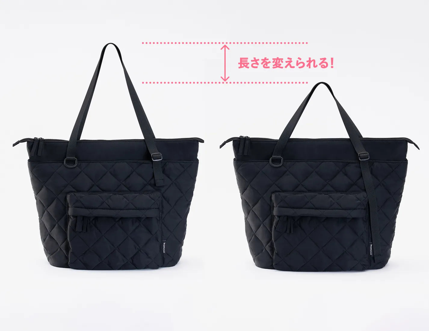 使用シーンや服装などその日のスタイルに合わせて、ストラップの長さを自由に調整可能。その日の気分やスタイルにぴったりフィットして、“ちょうどいい”使い心地を実現します。ベビーカーに掛けるときも、調整ひとつでストレスフリーに。