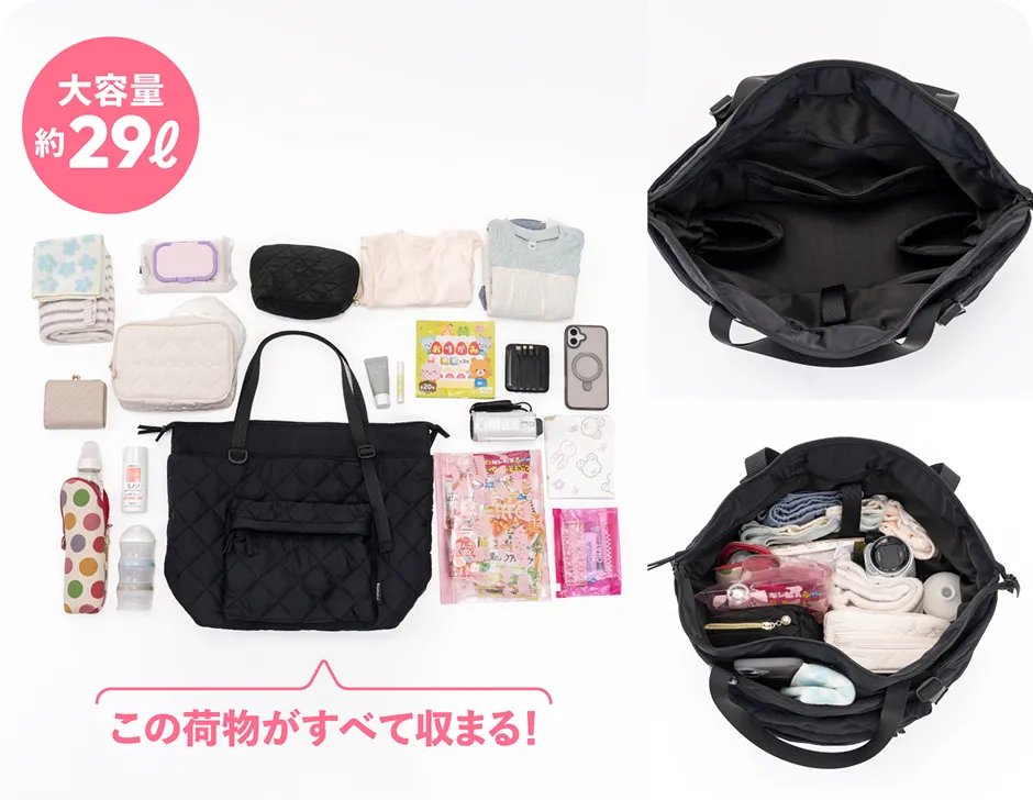 荷物が増えるお出かけの日も、頼れるのが嬉しい大容量。着替えやタオル、ピクニックグッズ、子どものおやつや遊び道具までしっかり入ります。仕切りやポケットも充実しているので、中身がごちゃつかず整理もらくらく。旅行やレジャー、帰省のときも「これひとつで大丈夫」と思える安心感です。