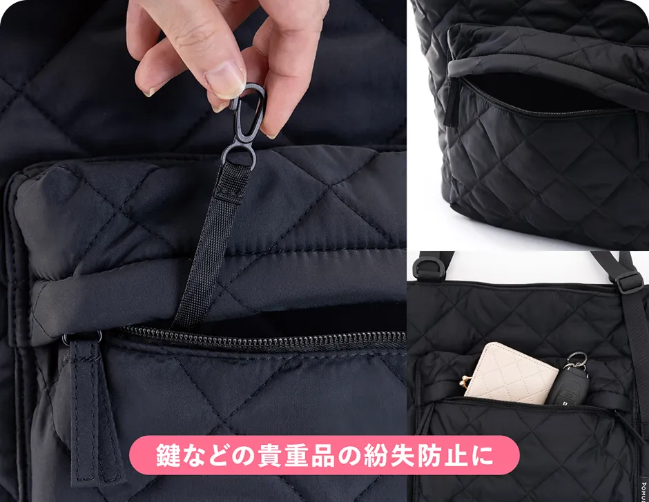 • バッグ内部の破損や、外部への漏れ・染みの原因になることがありますので、鋭利なものや液体の収納にはご注意ください