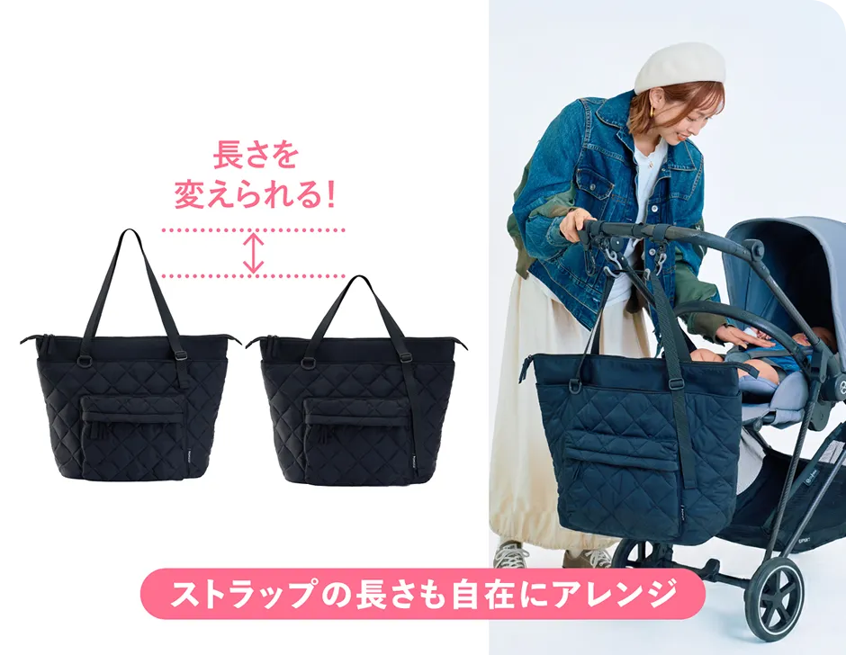 ベビーカーにかけても、肩にかけても使いやすいように、ショルダーベルトは調整可能。抱っこ紐やヒップシートと併用してもゴワつきにくく、赤ちゃんとの外出にストレスを感じさせません。おむつや着替え、哺乳瓶など、毎日の必需品がしっかり入る大容量。動きやすさと収納力、どちらも叶える“頼れるマザーズバッグ”です。